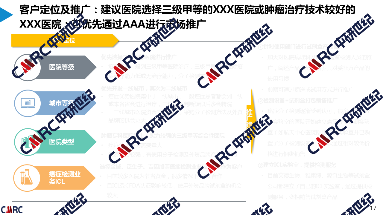 通過腫瘤科室醫(yī)生訪談及競品研究,獲取下述內(nèi)容 1、各類腫瘤疾病發(fā)病情況、病患特征及趨勢; 2、腫瘤確診流程及治療流程,其中應(yīng)用的檢測手段及指標(biāo)定量; 3、癌腫瘤臨床診斷和疾病監(jiān)測過程中的痛點(diǎn); 4、腫瘤檢測終端收費(fèi)水平; 5、腫瘤檢測市場競爭態(tài)勢。