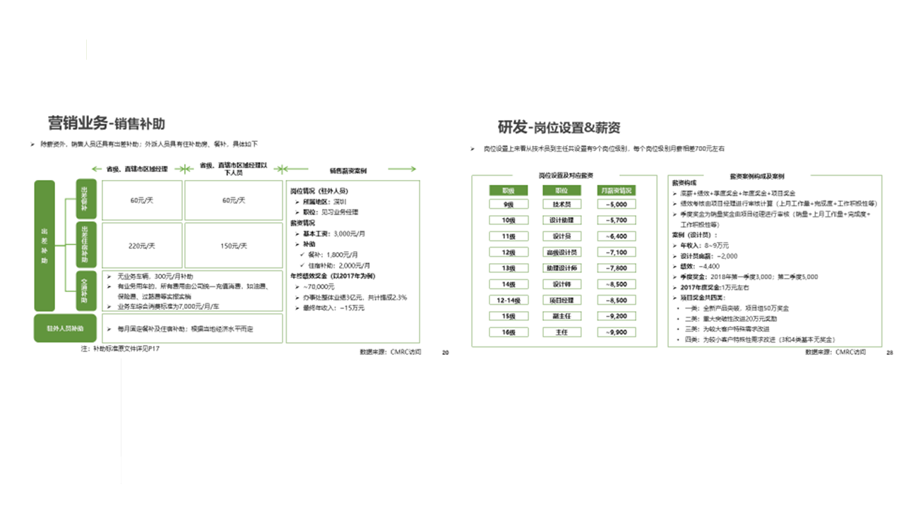 服務(wù)內(nèi)容:(1)銷售人員:不同層級銷售人員的薪酬體系構(gòu)成、績效考核方法、補助等; (2)研發(fā)人員:不同層級研發(fā)人員的薪酬體系構(gòu)成、績效考核方法、補助等。