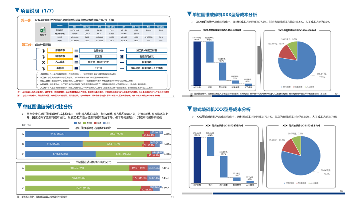 本次研究?jī)?nèi)容主要包括以下幾個(gè)方面:(1)目標(biāo)企業(yè)對(duì)標(biāo)產(chǎn)品價(jià)格體系進(jìn)行梳理(2)目標(biāo)企業(yè)對(duì)標(biāo)產(chǎn)品采購(gòu)零部件價(jià)格BOM清單進(jìn)行獲?。?)對(duì)目標(biāo)企業(yè)對(duì)標(biāo)產(chǎn)品生產(chǎn)成本、人工成本、原料成本及其他輔料相關(guān)成本進(jìn)行分析。