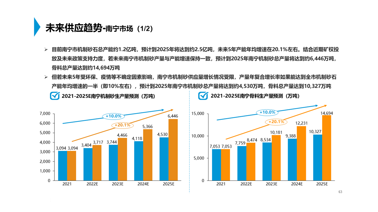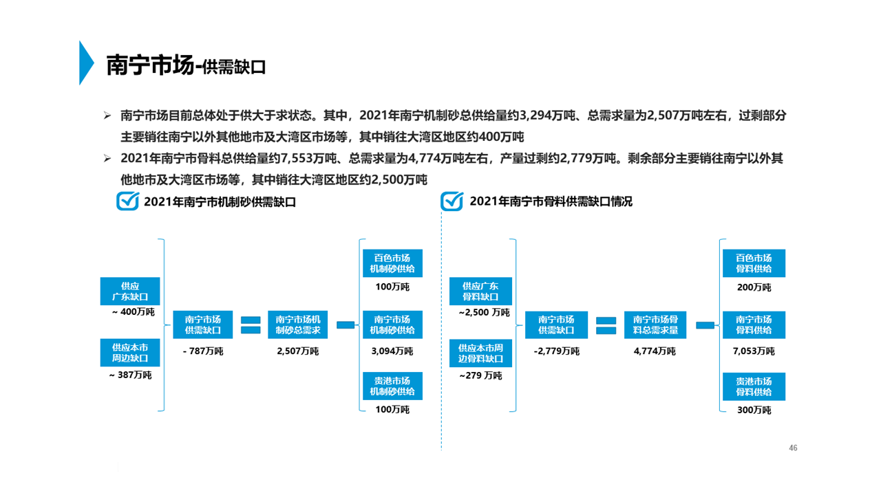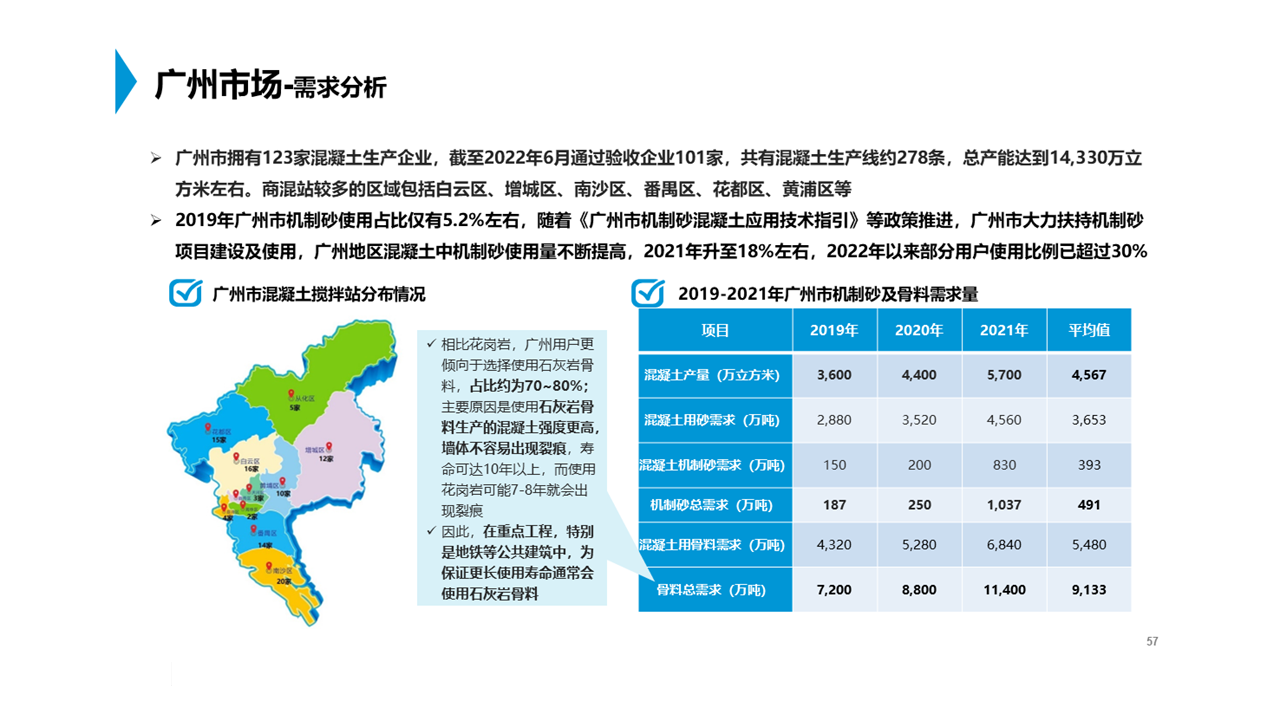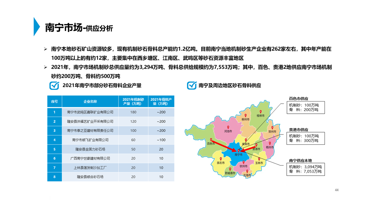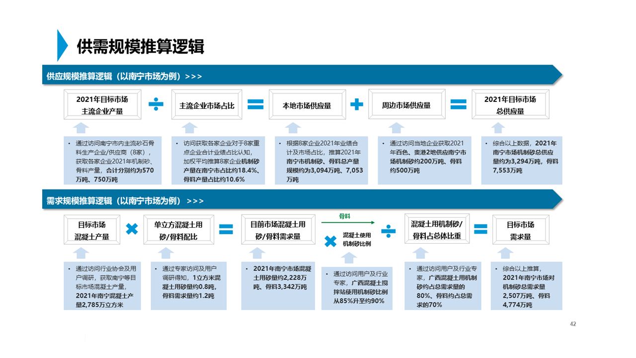 客戶需求:委托方下屬產(chǎn)業(yè)投資公司計(jì)劃參與廣西南寧地區(qū)的一處石灰?guī)r礦山投資,未來將開展機(jī)制砂、骨料等綠色建材的開采加工,想通過第三方的獨(dú)立客觀調(diào)研,分析該項(xiàng)目周邊主要市場的現(xiàn)有砂石骨料的供需規(guī)模、價(jià)格水平等,評(píng)估該項(xiàng)未來的預(yù)期收益,并圈定主要目標(biāo)市場范圍。