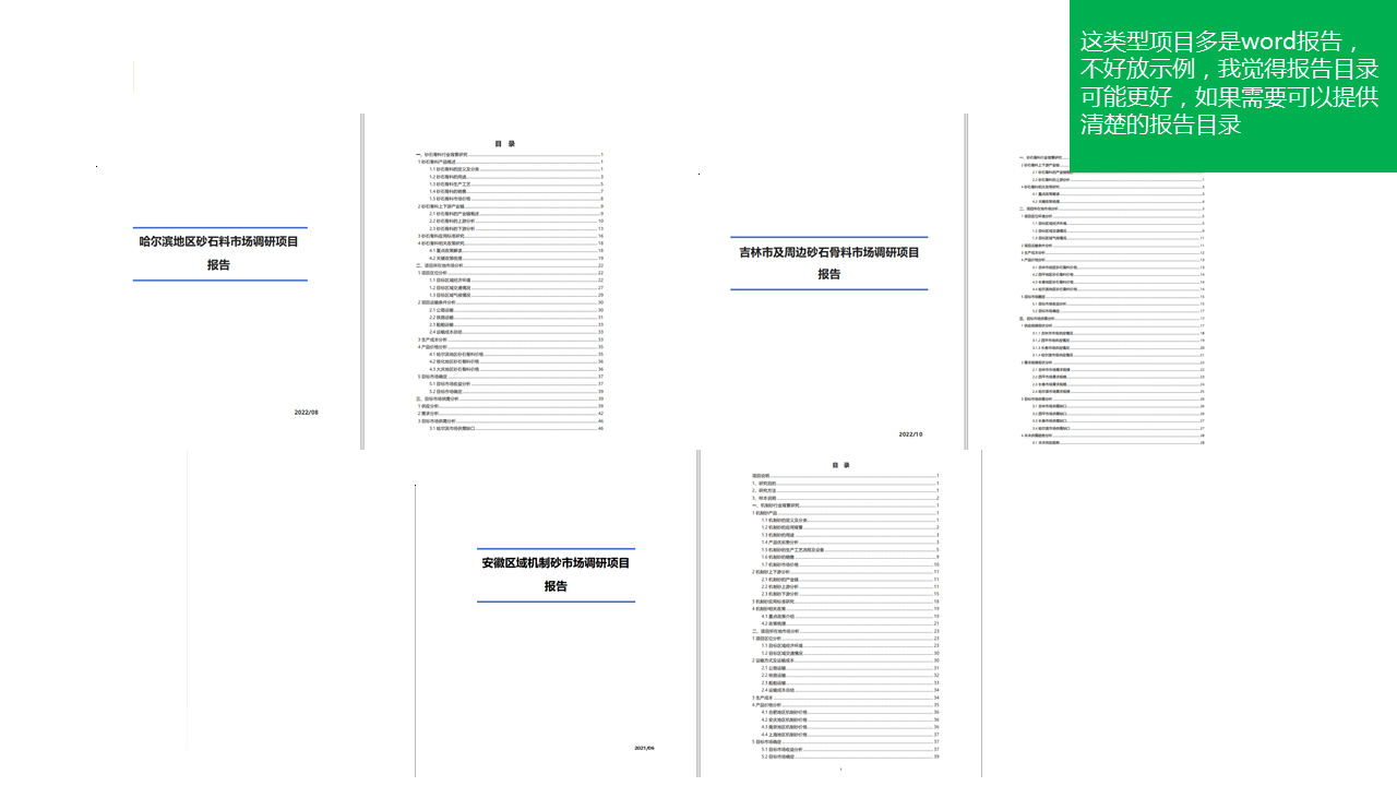 服務(wù)內(nèi)容:針對(duì)委托方需求本項(xiàng)目主要研究內(nèi)容包括:(1)項(xiàng)目地周邊省市的砂石礦山相關(guān)政策、經(jīng)濟(jì)、交通運(yùn)輸、下游行業(yè)等環(huán)境因素;(2)周邊主要城市機(jī)制砂、骨料的價(jià)格、毛利水平等;(3)本項(xiàng)目產(chǎn)品生產(chǎn)成本構(gòu)成;(4)周邊主要城市的機(jī)制砂、骨料現(xiàn)有供給量、供給來源等;(4)周邊主要城市對(duì)機(jī)制砂和骨料的需求量、主要用戶、需求趨勢等。