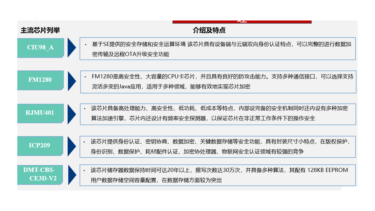 客戶(hù)需求:客戶(hù)提出需要了解一款產(chǎn)品為內(nèi)容保護(hù)芯片,內(nèi)容保護(hù)芯片分為兩大類(lèi):一類(lèi)是專(zhuān)門(mén)的內(nèi)容保護(hù)芯片,一類(lèi)是SE芯片(可以存儲(chǔ)部分代碼,并有一定計(jì)算能力)研究過(guò)程中需要確認(rèn)兩類(lèi)芯片類(lèi)型 本次項(xiàng)目需要了解市場(chǎng)中用于設(shè)備關(guān)鍵數(shù)據(jù)內(nèi)容安全保護(hù)的芯片有哪些,典型代表廠商(客戶(hù)推薦5家供應(yīng)商作為調(diào)查對(duì)象)。