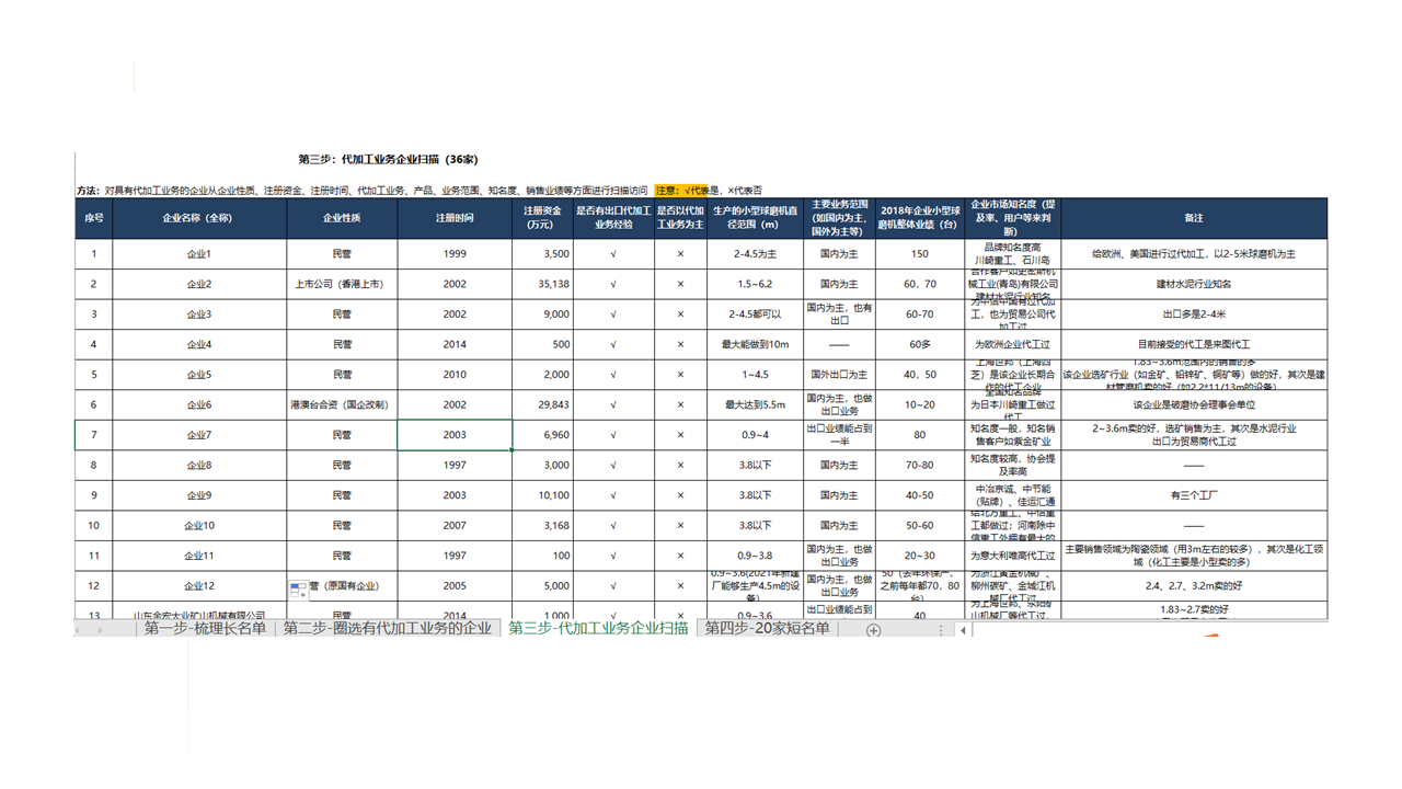 客戶需求:客戶準(zhǔn)備開(kāi)拓小型球磨機(jī)業(yè)務(wù),需要尋找5家國(guó)內(nèi)比較知名并符合標(biāo)準(zhǔn)的小型球磨機(jī)生產(chǎn)企業(yè),想要找國(guó)內(nèi)的OEM合作伙伴,篩選符合標(biāo)準(zhǔn)的供應(yīng)商。