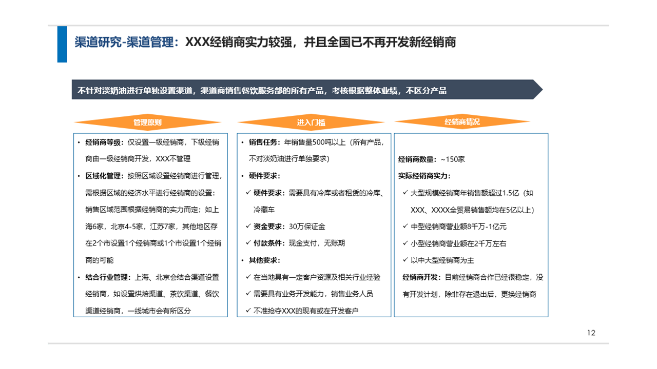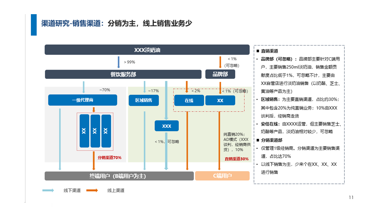 客戶需求:客戶指定5家乳制品樣本企業(yè),通過(guò)研究樣本企業(yè)的乳制品-奶油的銷售渠道構(gòu)成,線上線下渠道貢獻(xiàn)占比,經(jīng)銷商渠道管理方式等,對(duì)企業(yè)現(xiàn)有渠道進(jìn)行適量化調(diào)整及優(yōu)化。
