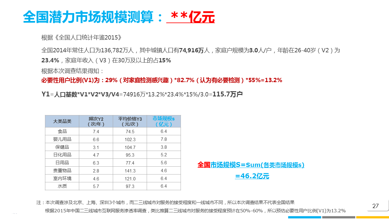 評(píng)估家庭安全檢測(cè)服務(wù)的規(guī)模潛力,明確哪些細(xì)分品類(lèi)值得進(jìn)入;誰(shuí)是目標(biāo)用戶群體;并對(duì)服務(wù)定價(jià)和收費(fèi)模式給出建議。