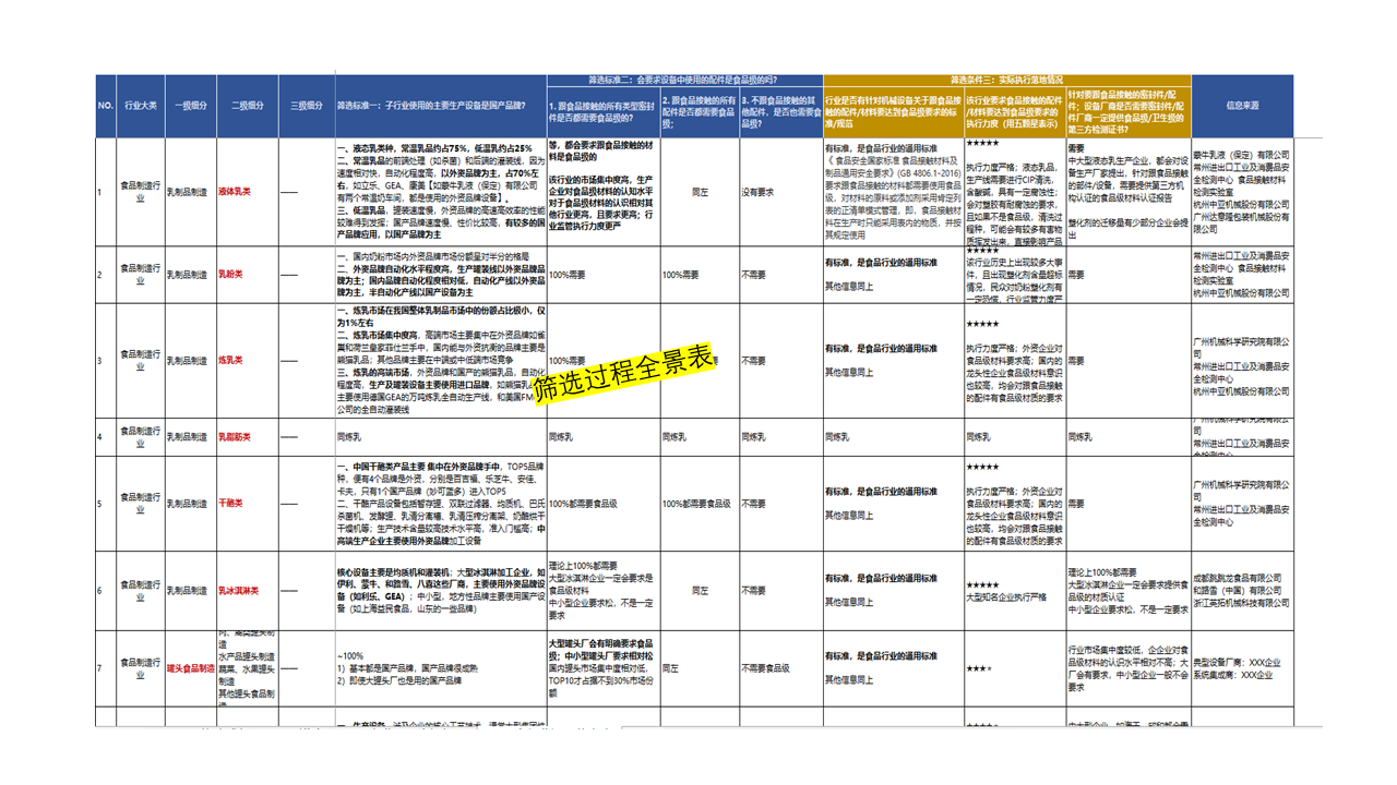 服務(wù)內(nèi)容:從34個(gè)細(xì)分子行業(yè)中,挑選出核心生產(chǎn)設(shè)備有機(jī)會(huì)應(yīng)用委托方產(chǎn)品的行業(yè),即主要生產(chǎn)設(shè)備是國產(chǎn)品牌,同時(shí)要求設(shè)備中使用的配件是食品級的; 針對有委托方產(chǎn)品應(yīng)用機(jī)會(huì)的細(xì)分行業(yè),調(diào)查行業(yè)自身發(fā)展現(xiàn)狀及前景,進(jìn)而篩選出潛力較大的5個(gè)細(xì)分行業(yè); 針對5個(gè)潛力行業(yè),了解其全工序環(huán)節(jié)的設(shè)備應(yīng)用特征,并梳理出各類設(shè)備的龍頭企業(yè)。