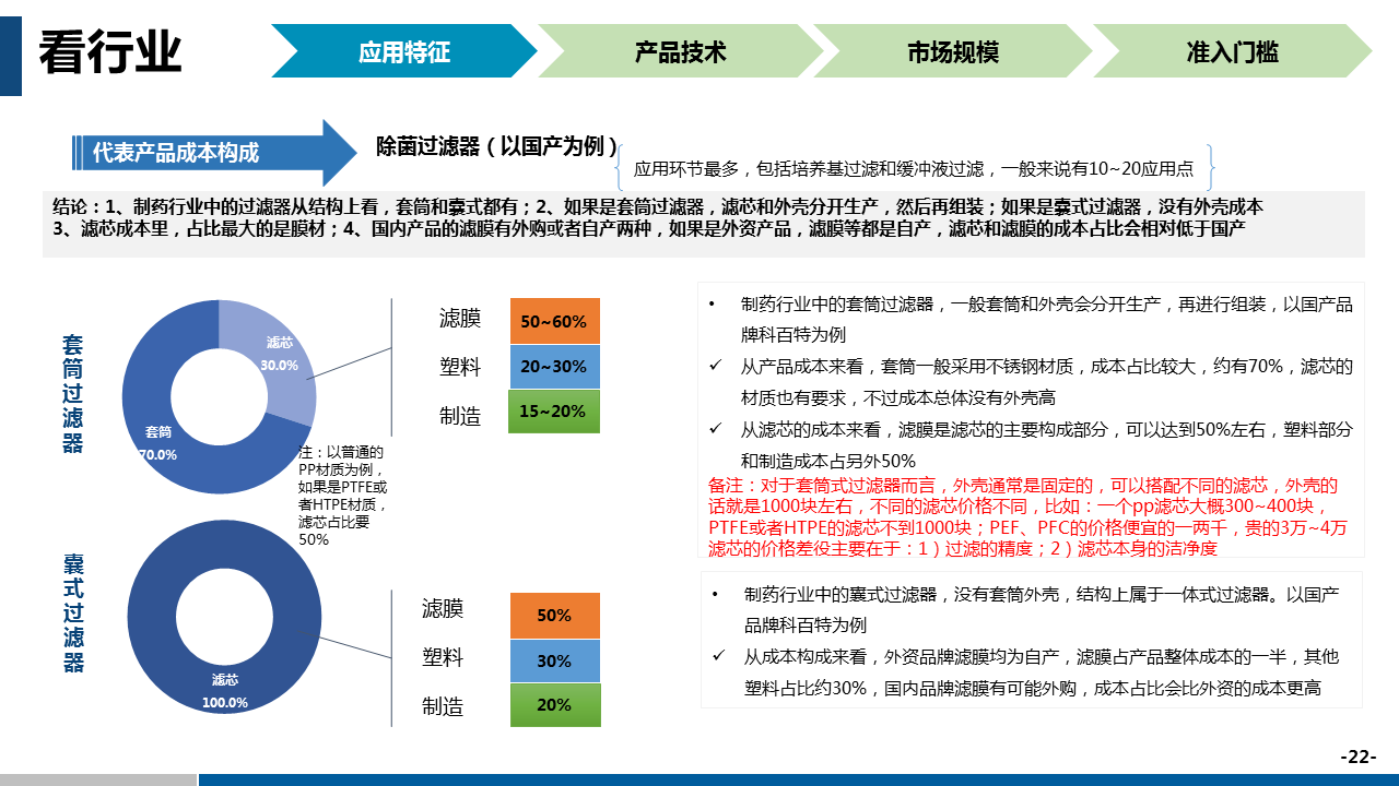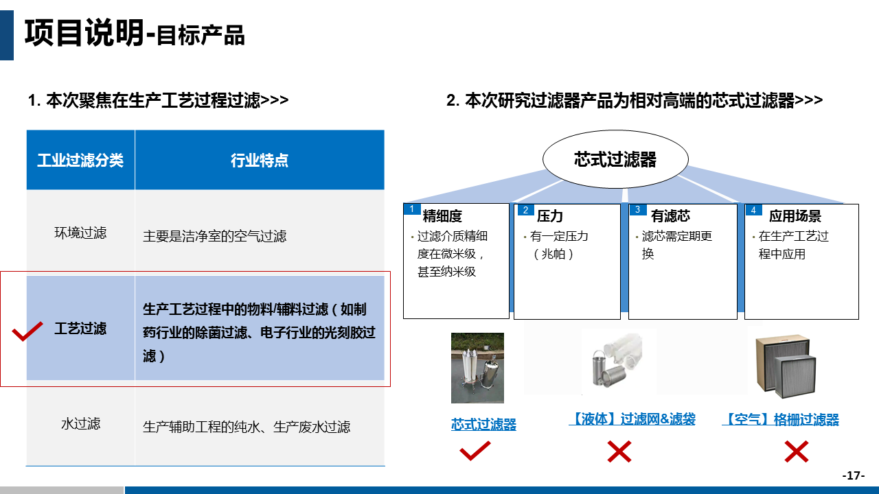 分析行業(yè)背景:梳理行業(yè)細(xì)分結(jié)構(gòu)、了解行業(yè)發(fā)展環(huán)境、產(chǎn)業(yè)鏈結(jié)構(gòu)及區(qū)域分布特征 分析過濾器應(yīng)用:梳理應(yīng)用節(jié)點(diǎn)及需求特征、了解技術(shù)路線、評(píng)估規(guī)模潛力及技術(shù)門檻 分析下游用戶:確定誰是客戶?客戶在哪里? 并了解典型客戶的需求特征。 分析潛在對(duì)手:確定跟誰競爭?核心競爭要素是什么?主要競爭對(duì)手的市場表現(xiàn)如何?