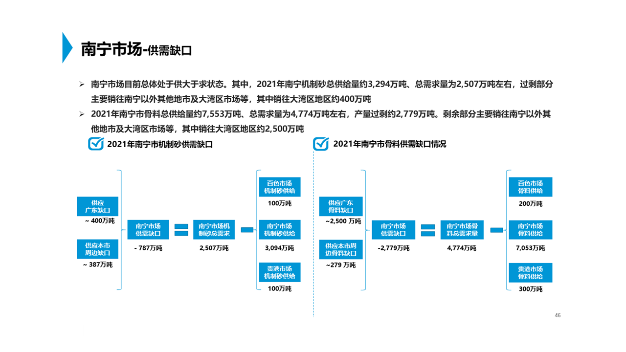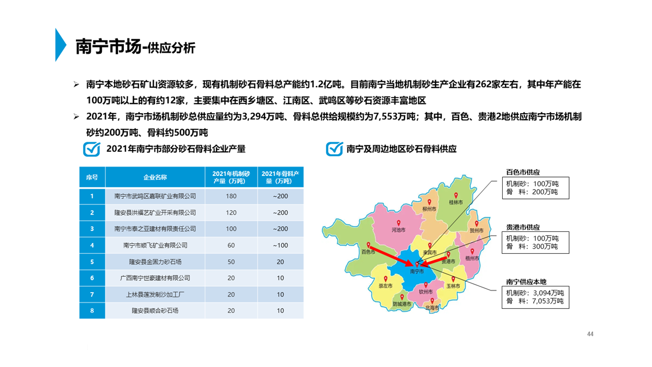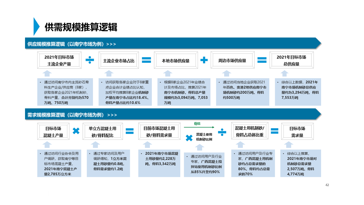 委托方下屬產(chǎn)業(yè)投資公司計(jì)劃參與廣西南寧地區(qū)的一處石灰?guī)r礦山投資,未來將開展機(jī)制砂、骨料等綠色建材的開采加工,想通過第三方的獨(dú)立客觀調(diào)研,分析該項(xiàng)目周邊主要市場的現(xiàn)有砂石骨料的供需規(guī)模、價(jià)格水平等,評(píng)估該項(xiàng)未來的預(yù)期收益,并圈定主要目標(biāo)市場范圍。