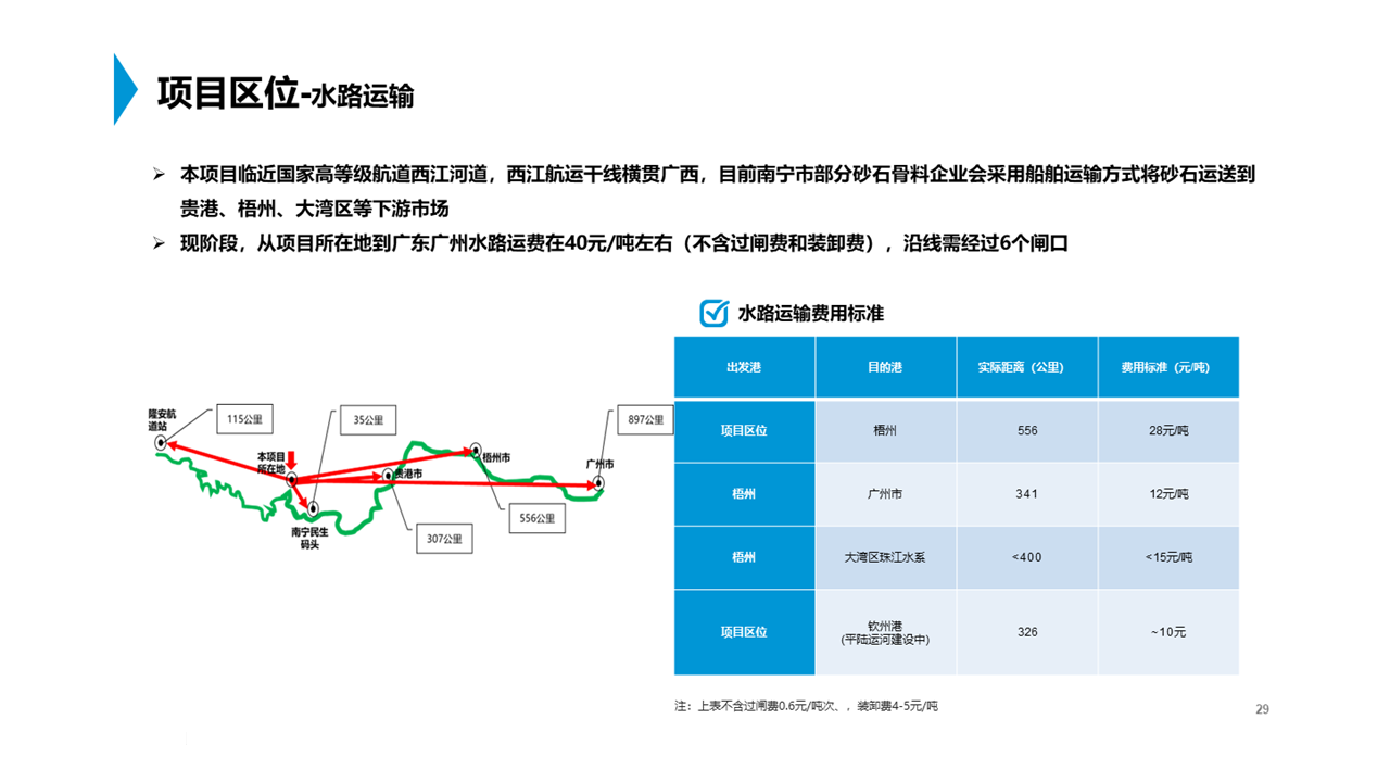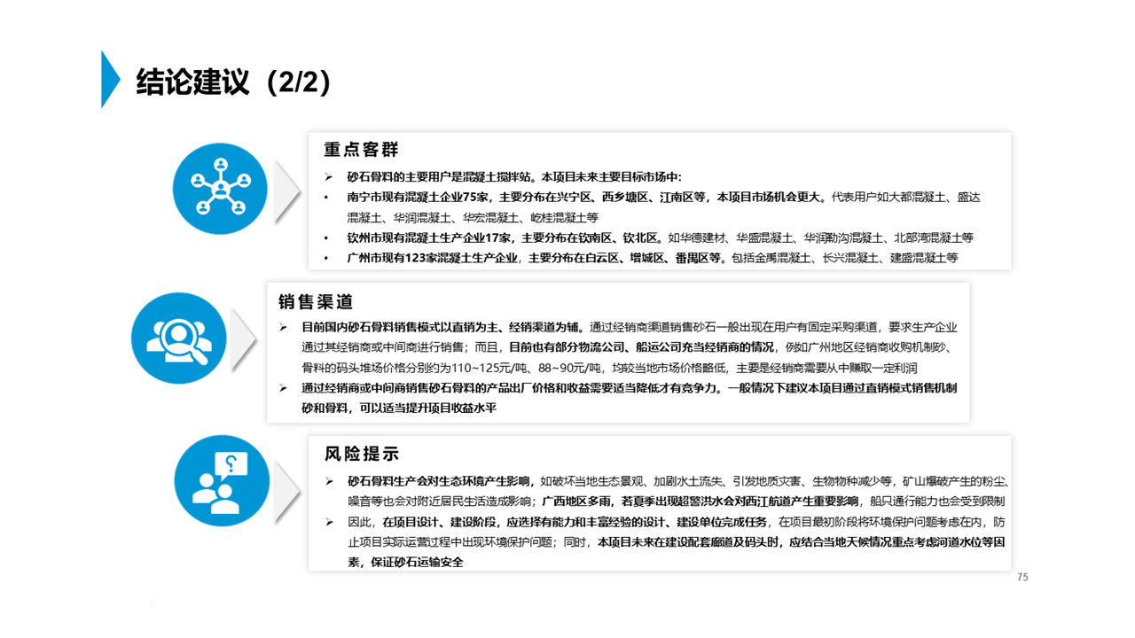 通過對(duì)項(xiàng)目地到周邊主要需求市場的運(yùn)輸條件、產(chǎn)品預(yù)期收益等,確定了未來本項(xiàng)目機(jī)制砂和骨料產(chǎn)品的重點(diǎn)市場為南寧、廣州等城市,并根據(jù)各市場的競爭環(huán)境、供需缺口和發(fā)展趨勢等,給出本項(xiàng)目未來的生產(chǎn)規(guī)模、重點(diǎn)客群、產(chǎn)品定價(jià)、運(yùn)輸方式、銷售渠道等方面的建議。