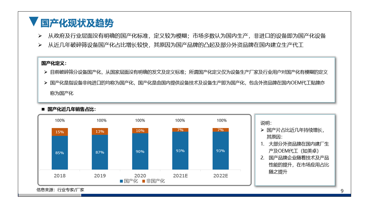 通過對(duì)參與國(guó)內(nèi)市場(chǎng)的主流企業(yè)調(diào)研,明確了國(guó)內(nèi)礦山破碎篩分設(shè)備市場(chǎng)總體規(guī)模、下游各領(lǐng)域用戶數(shù)量,以及不同應(yīng)用領(lǐng)域的破碎篩分設(shè)備市場(chǎng)規(guī)模,讓委托方了解國(guó)內(nèi)現(xiàn)有市場(chǎng)體量及未來發(fā)展?jié)摿?,?duì)自身市場(chǎng)定位更加清晰;同時(shí)根據(jù)設(shè)備國(guó)產(chǎn)化要求及發(fā)展趨勢(shì),重點(diǎn)推動(dòng)國(guó)產(chǎn)化率水平更高的產(chǎn)品類型。