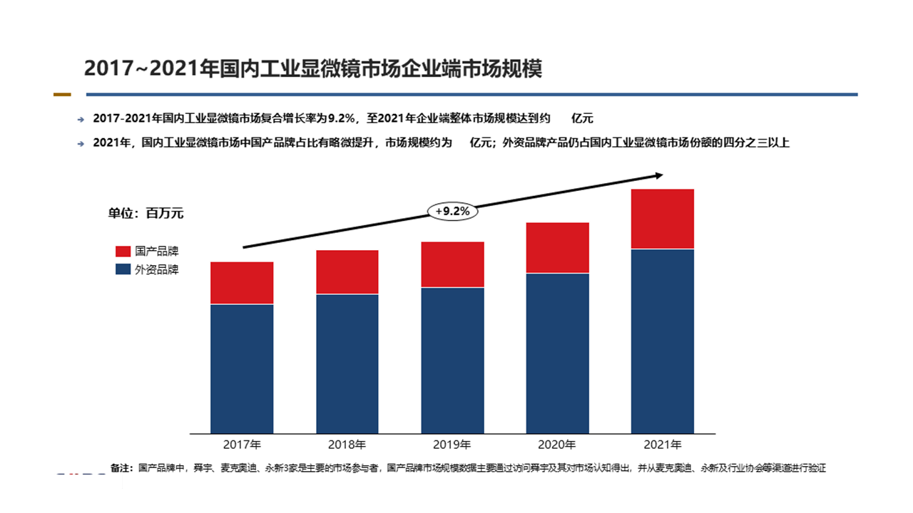 研究成果:為委托方明確國內(nèi)工業(yè)顯微鏡市場現(xiàn)有競爭環(huán)境,了解未來市場發(fā)展?jié)摿椭饕獞?yīng)用領(lǐng)域,并掌握主要競爭對手的主推產(chǎn)品、發(fā)力方向和重點(diǎn)客群,為委托方制定未來銷售計劃提供依據(jù)。