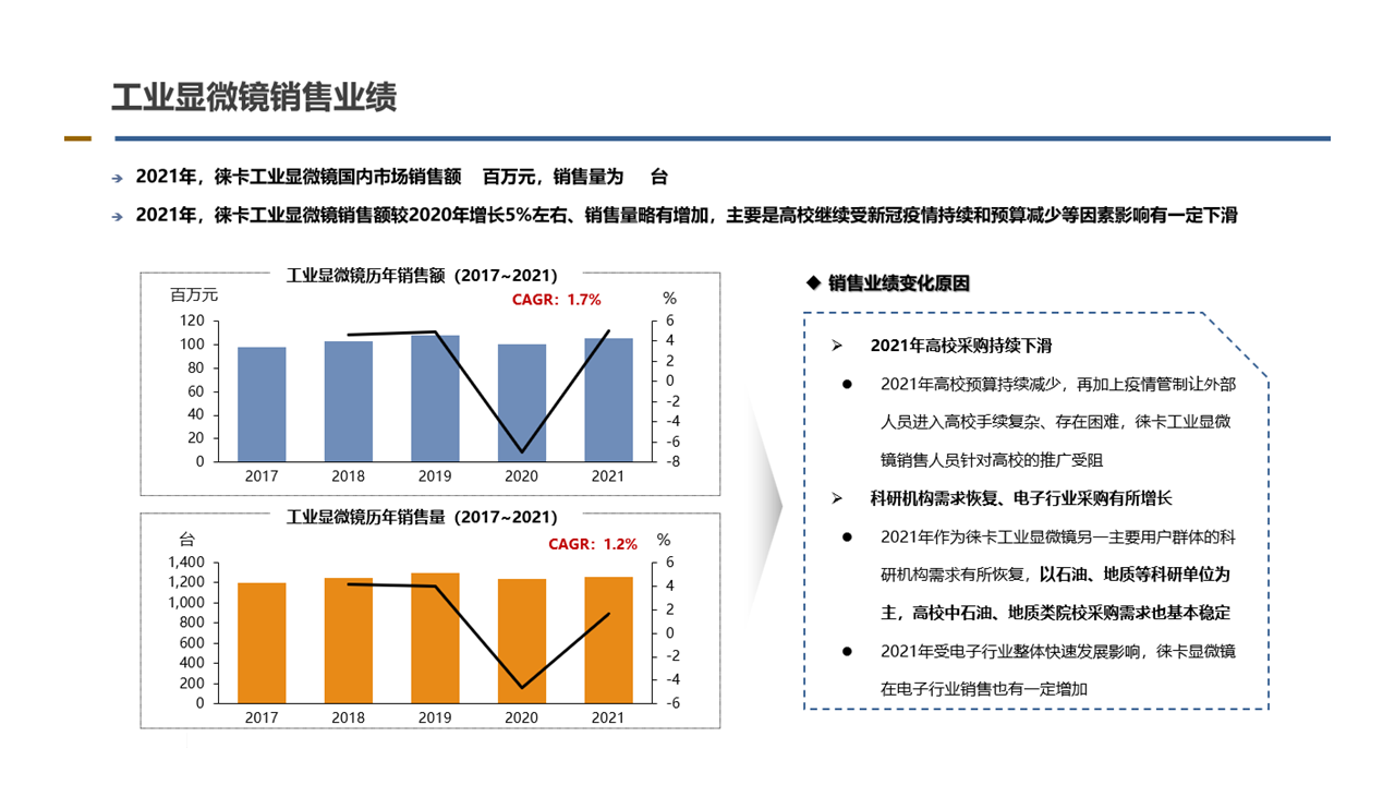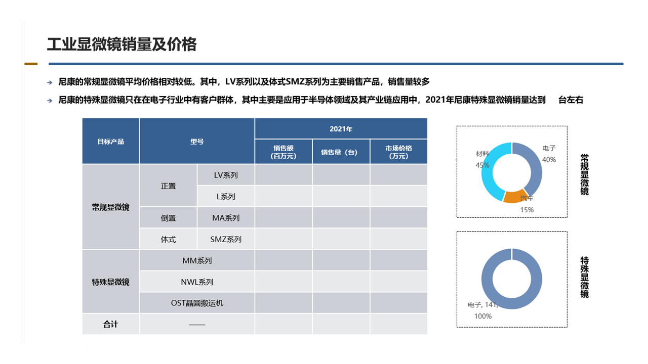 客戶需求:鑒于近年來國內(nèi)電子、汽車、材料等領(lǐng)域?qū)︼@微鏡鏡需求不斷增長,同時國產(chǎn)化設(shè)備替代也不斷推進(jìn),希望通過了解國內(nèi)市場顯微鏡主流參與企業(yè)的業(yè)績變化和主要用戶群體,借助自身品牌和渠道優(yōu)勢,拓展更多市場應(yīng)用機(jī)會。