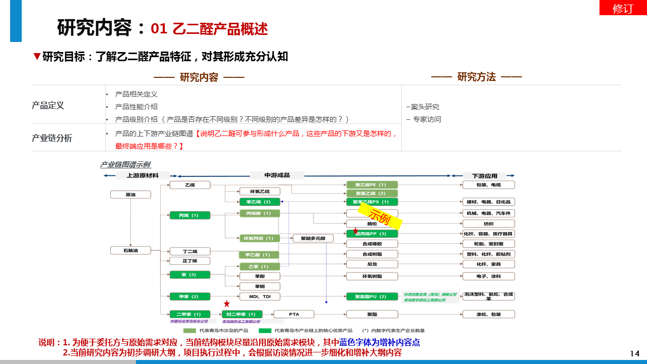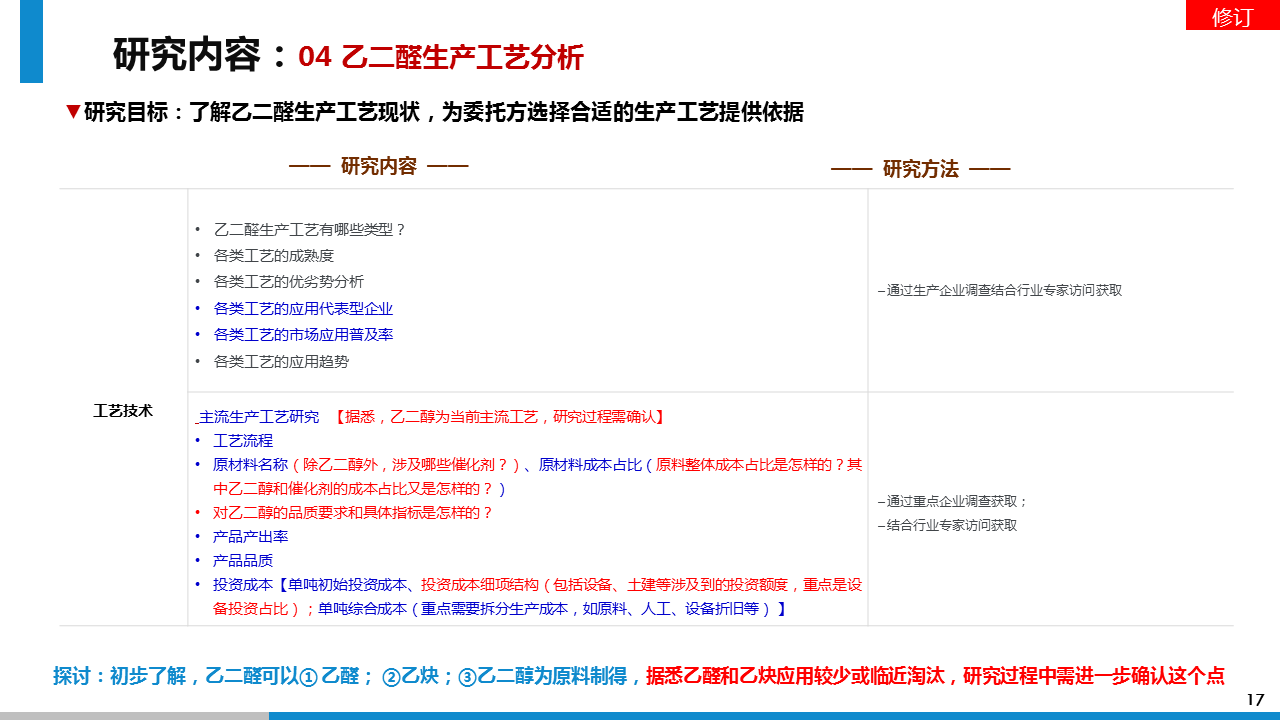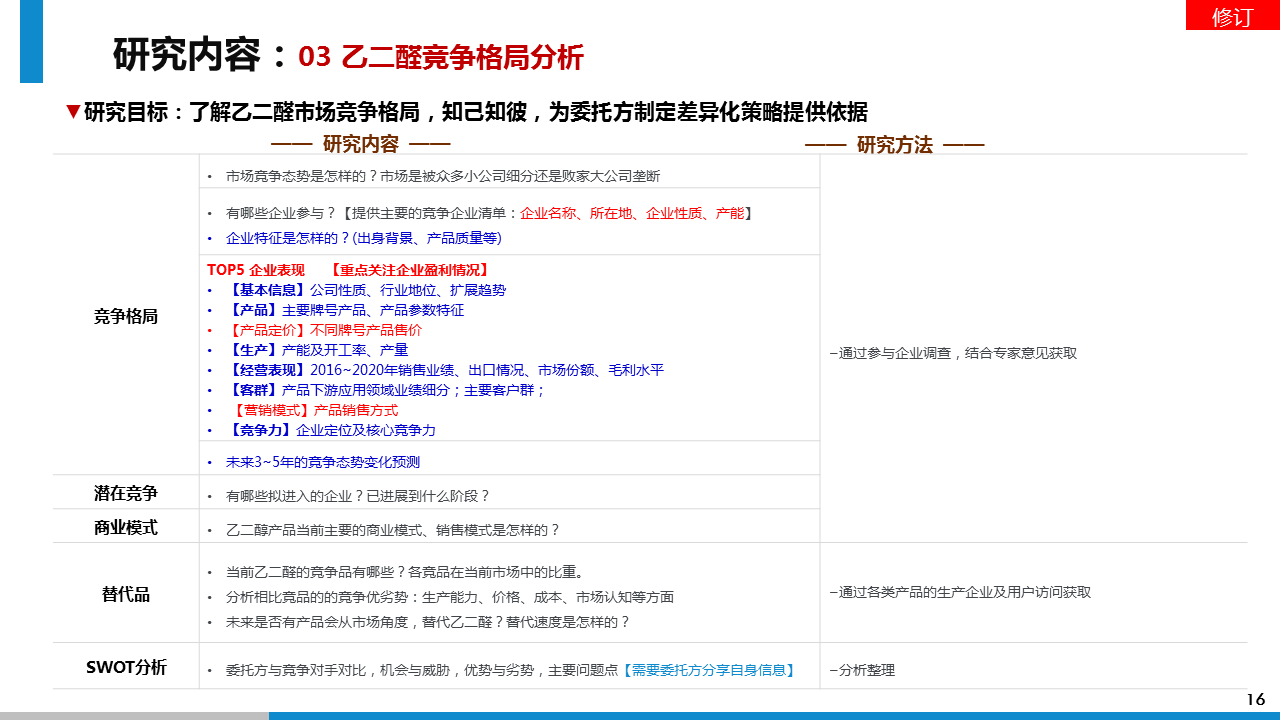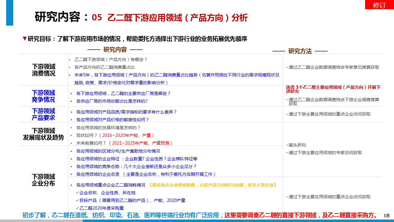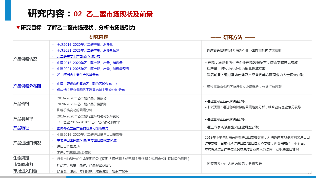 研究成果:透過此次市場調(diào)研,我方通過對對乙二醛項目的可行性判斷、行業(yè)的壁壘及風(fēng)險分析、投資收益分析等方面的調(diào)研分析,給予委托方進入乙二醛行業(yè)的市場策略建議。