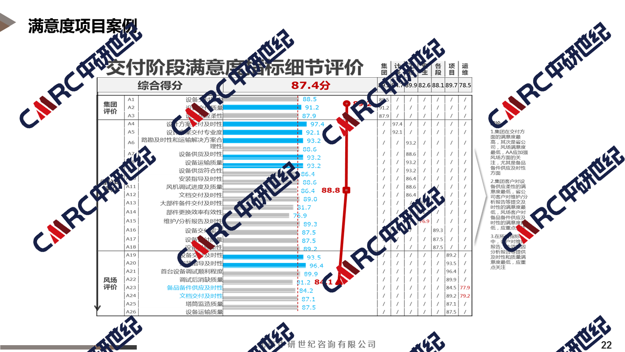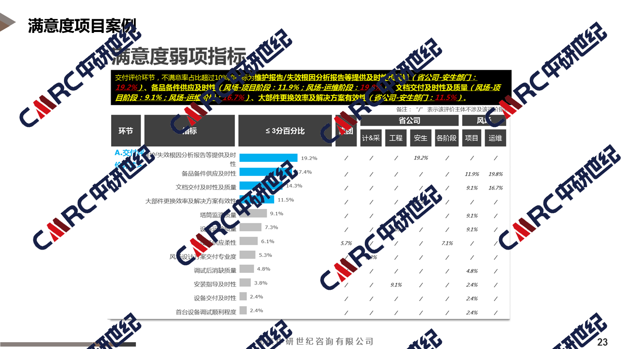 服務(wù)內(nèi)容:本次調(diào)查從集團、省公司、風(fēng)場三個維度,就交付、產(chǎn)品、服務(wù)三大塊內(nèi)容進行滿意度評價。由于三類角色在項目全程中工作內(nèi)容不同,故三類角色分別設(shè)計不同的指標體系,并根據(jù)其職能特點,細分如下分析維度:計劃、采購、安生、工程、項目、運維