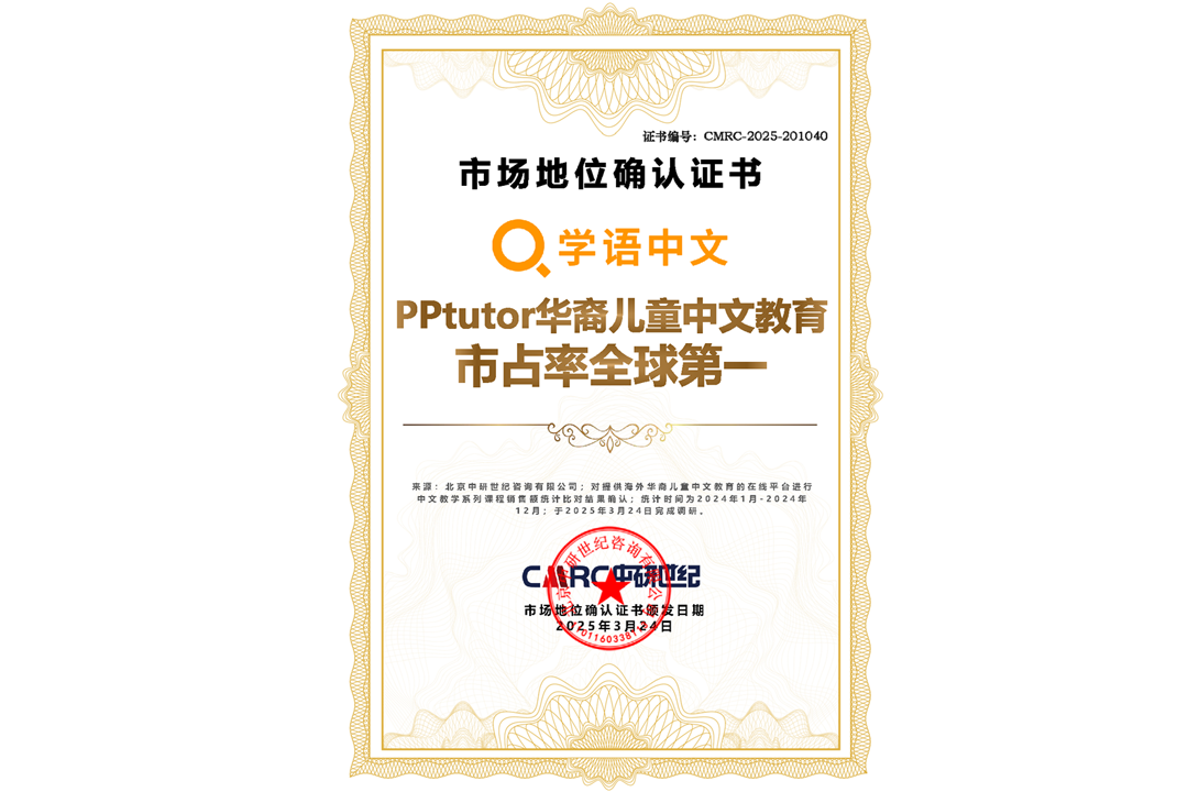 首頁 > 市場地位證明 > 市場地位證明丨PPtutor華裔兒童中文教育市占率全球第一認證證書