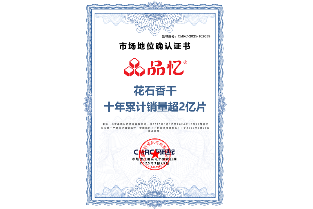 首頁 > 市場地位證明 > 市場地位證明丨品憶花石香干十年累計銷量超2億片認(rèn)證證書