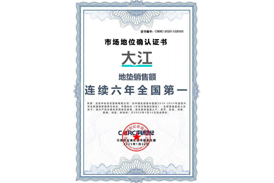首頁(yè) > 市場(chǎng)地位證明 > 市場(chǎng)地位證明丨大江地墊銷售額連續(xù)六年全國(guó)第一認(rèn)證證書(shū)