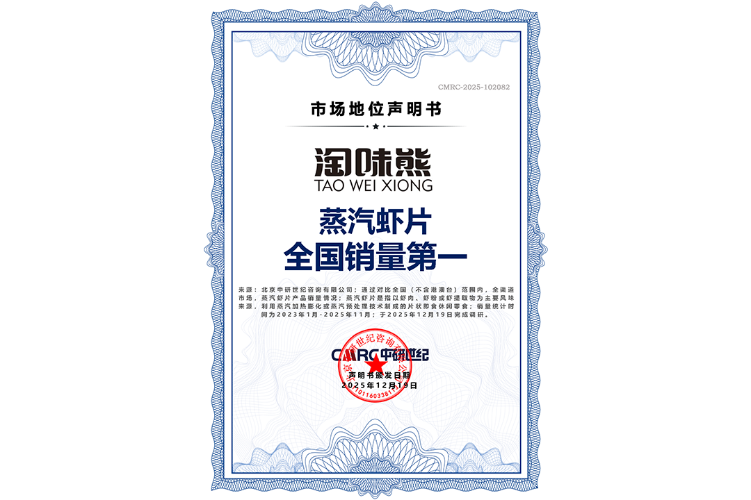 首頁 > 市場地位證明 > 市場地位證明丨淘味熊-蒸汽蝦片全國銷量第一市場地位聲明證書