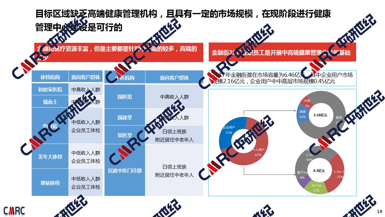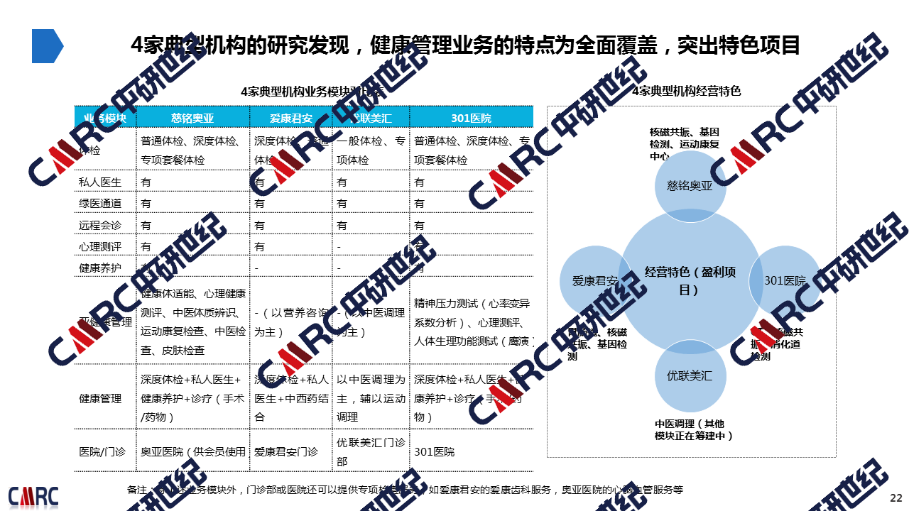 Research results:Through national health industry policy research, conduct market feasibility study and demonstration, complete strategic development orientation and financial model calculation of hospital; In addition, provide suggestions for operation: Establish a self-built health management center to provide health management services for customers.