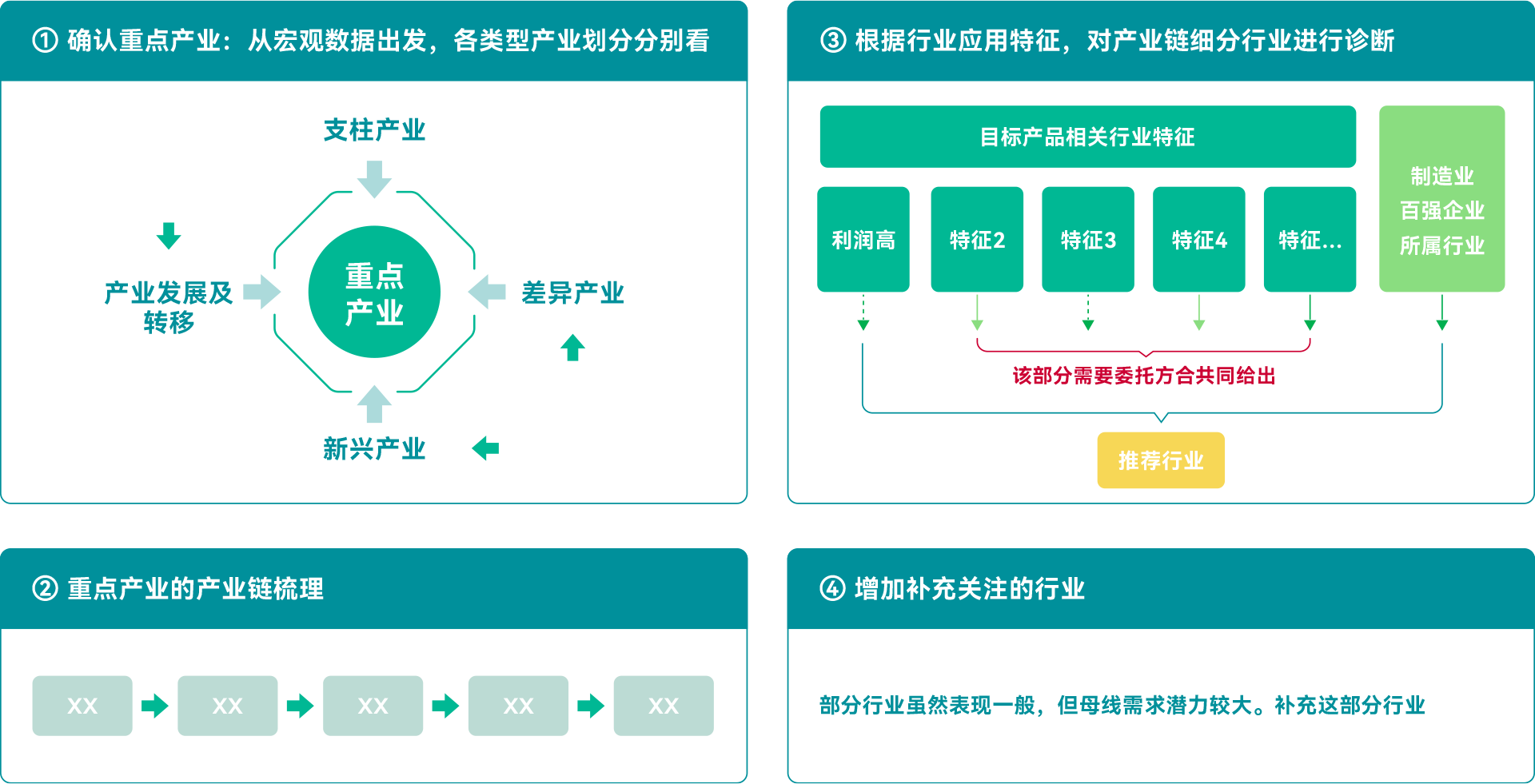 結合企業(yè)產品業(yè)務體系,通過區(qū)域市場重點產業(yè)/行業(yè)梳理,幫助企業(yè)縮短區(qū)域市場摸排時間